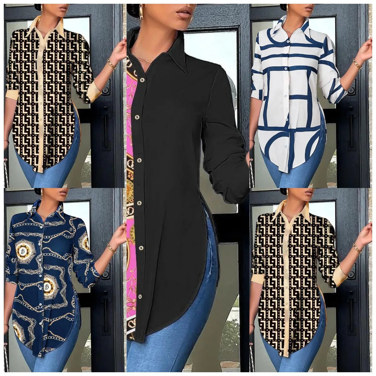 Autumn Casual Shirt Women Turn Down Collar Print Long Sleeve Shirts Loose Casual Split Blouse Button Tops Office Ladies