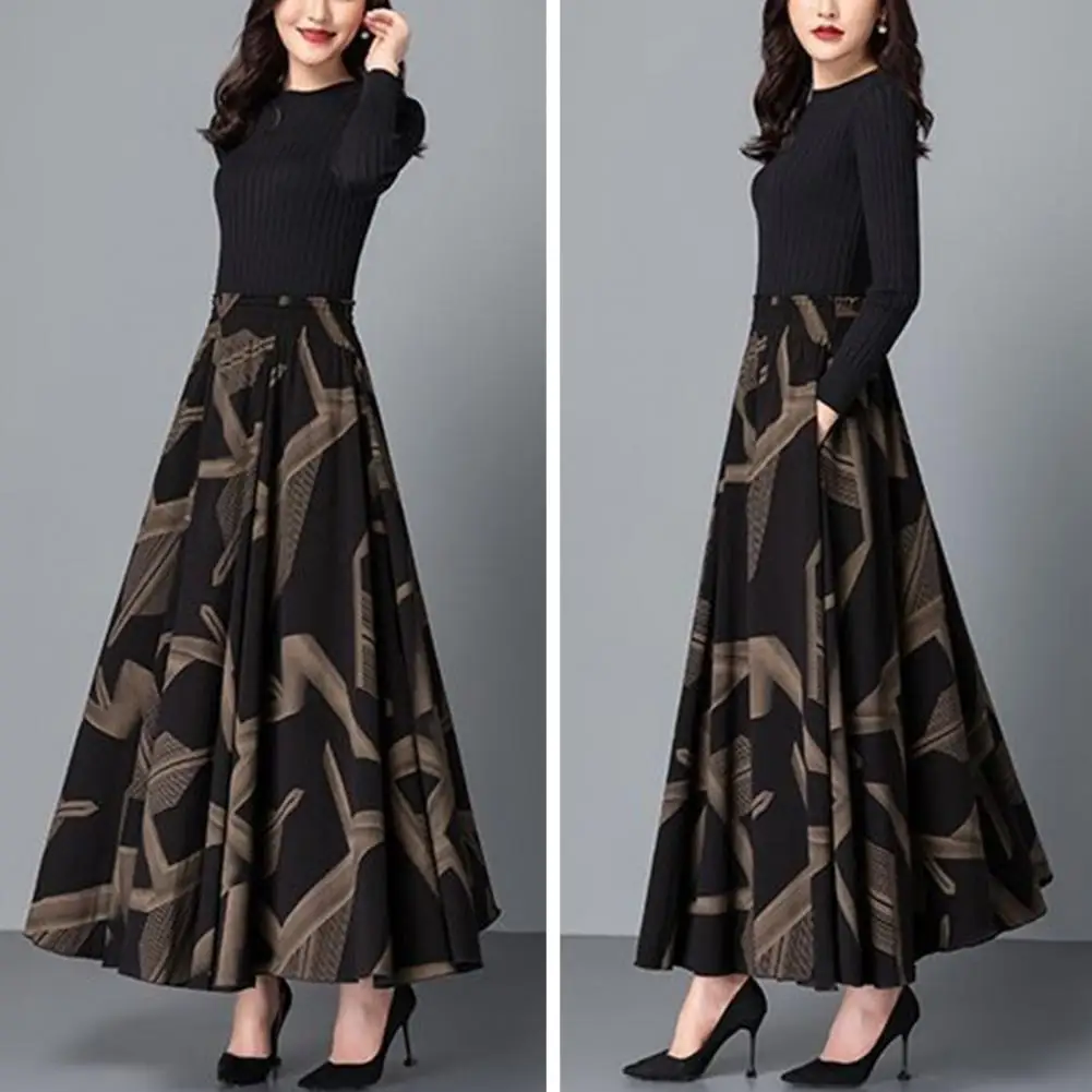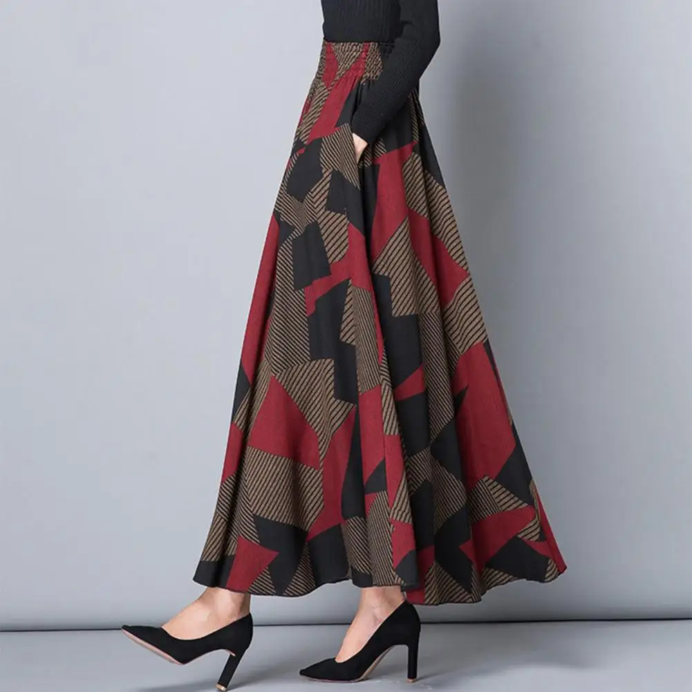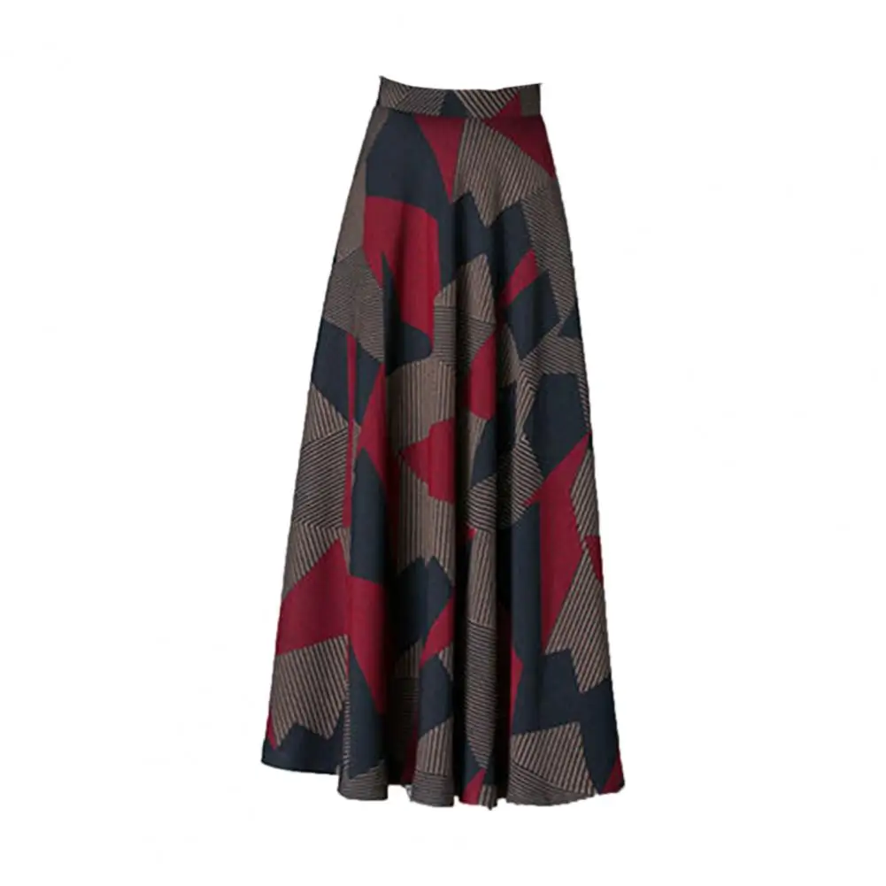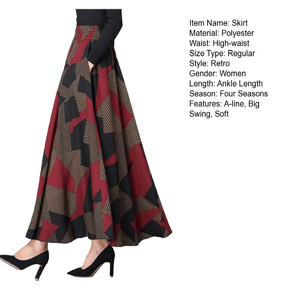 Women Skirt High Waist Big Hem A-line Colorblock Loose Ankle Length Soft Pockets Retro Ruffle Elegant Party Commute Lady Maxi Skirt