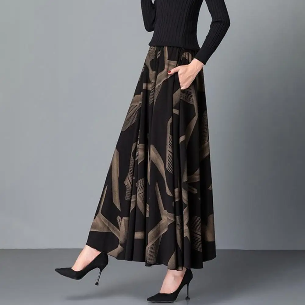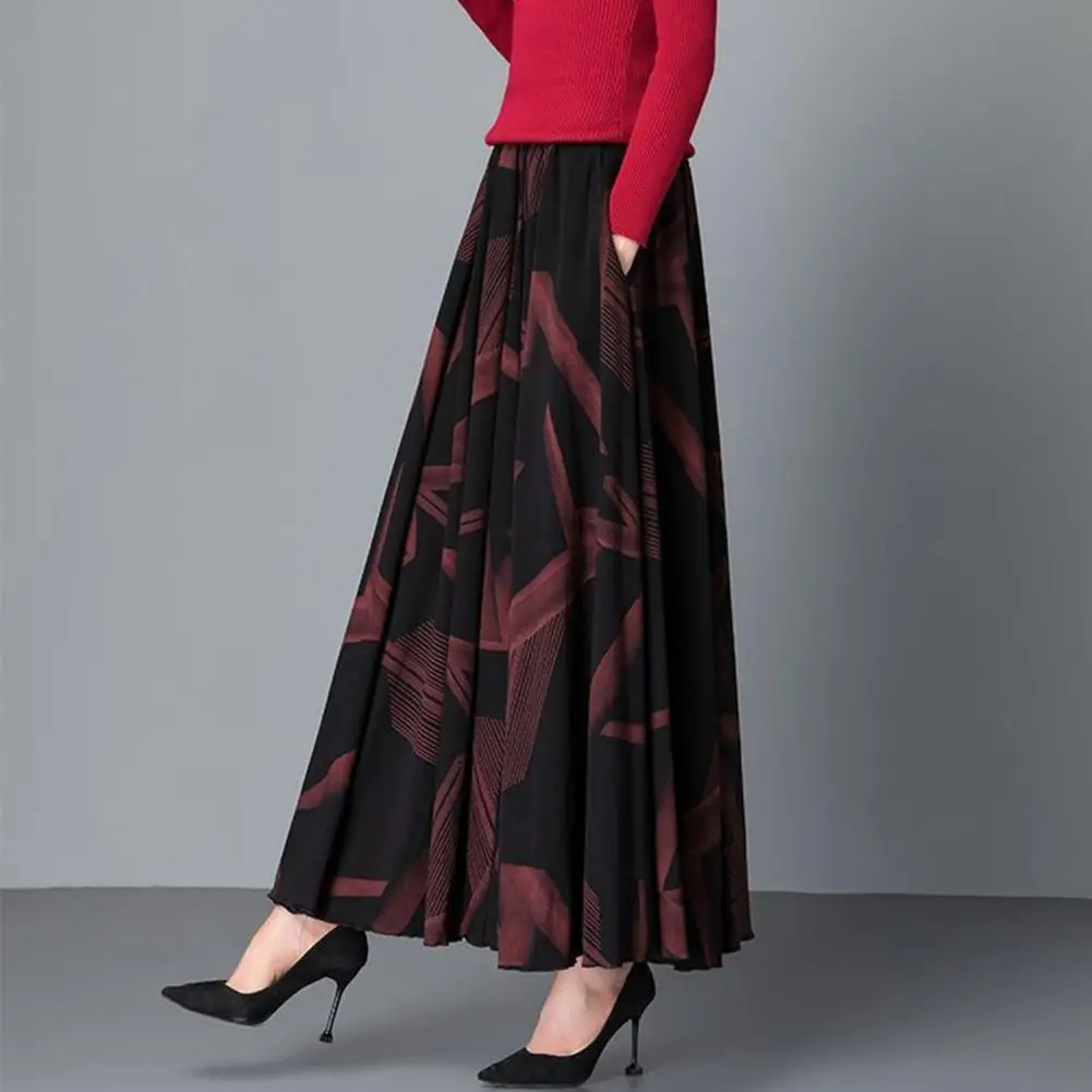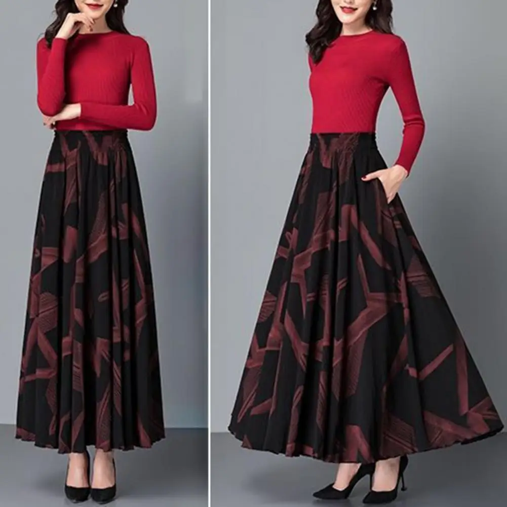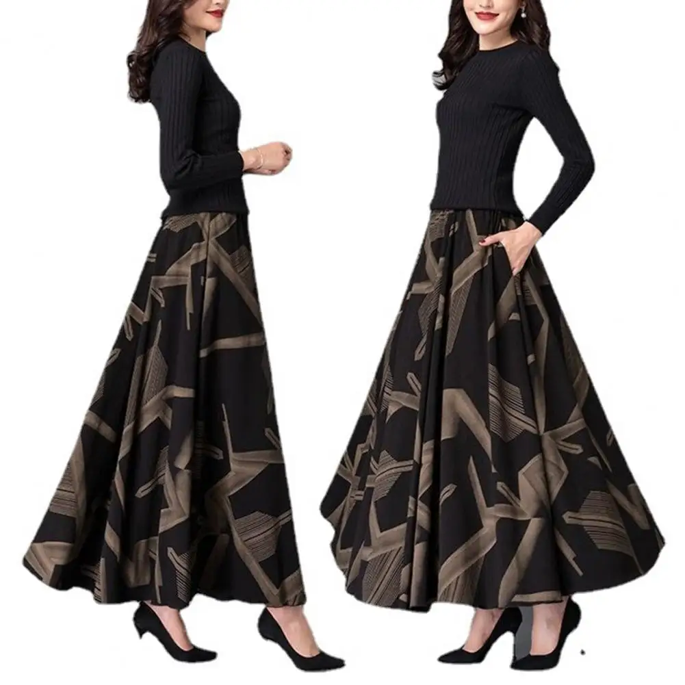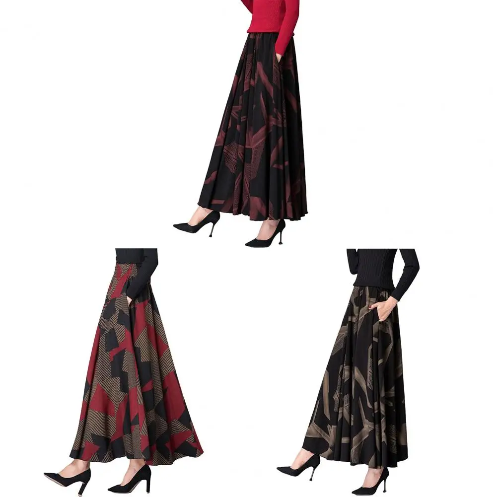 Women Skirt High Waist Big Hem A-line Colorblock Loose Ankle Length Soft Pockets Retro Ruffle Elegant Party Commute Lady Maxi Skirt